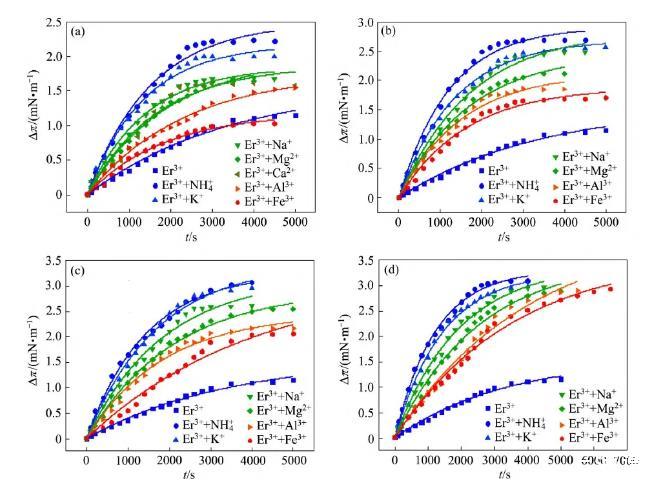 本文根據(jù)離子型稀土礦原地浸礦液的成分組成,選擇NH4+、Na+、K+、Mg2+、Ca2+、Al3+、Fe3+等離子為共存陽離子的代表,Er3+離子作為鑭系重稀土的代表。采用LB膜技術(shù)測(cè)定不同種類陽離子與稀土Er3+離子共存時(shí)的P507 分子單層Δπ?t 曲線,研究水溶液中與稀土離子共存的不同種類陽離子的競(jìng)爭(zhēng)擴(kuò)散和吸附行為對(duì)稀土離子與P507 分子相互作用的影響規(guī)律。通過動(dòng)態(tài)界面張力實(shí)驗(yàn)表征、結(jié)合分子動(dòng)力學(xué)模擬,解釋了共存陽離子競(jìng)爭(zhēng)吸附影響稀土萃取分離選擇性的界面鹽效應(yīng)及其作用機(jī)制。