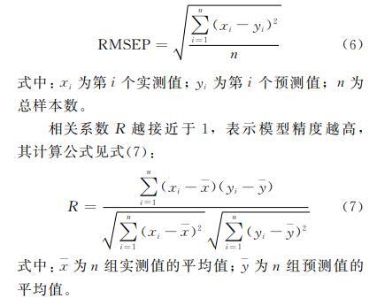 模型的預測能力由預測均方根誤差RMSEP(Root mean square error of prediction)以及觀測值與模型預測結果之間的相關系數R來衡量。兩者都常用來描述模型的精準性,RMSEP常被用來量化模型精度,而R常被用來評估模型的準確性。RMSEP數值越低,表明回歸模型越精確,其計算公式如式(6)所示: