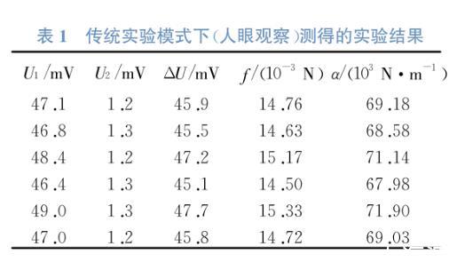人眼直接觀察數字電壓表,記錄金屬環拉斷液柱前的瞬間數字電壓表讀數U1和拉斷液柱后數字電壓表的讀數U2;測得的數據如表1所示。