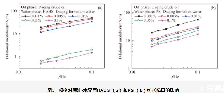 不同含量的HABS和PS在大慶原油-水界面的擴(kuò)張模量隨頻率的變化趨勢如圖5所示。可以看出,HABS和PS在原油-水界面的擴(kuò)張模量隨著頻率增大而線性增加,這與圖3中正癸烷-水界面的變化趨勢相同,作用機(jī)制也相同。