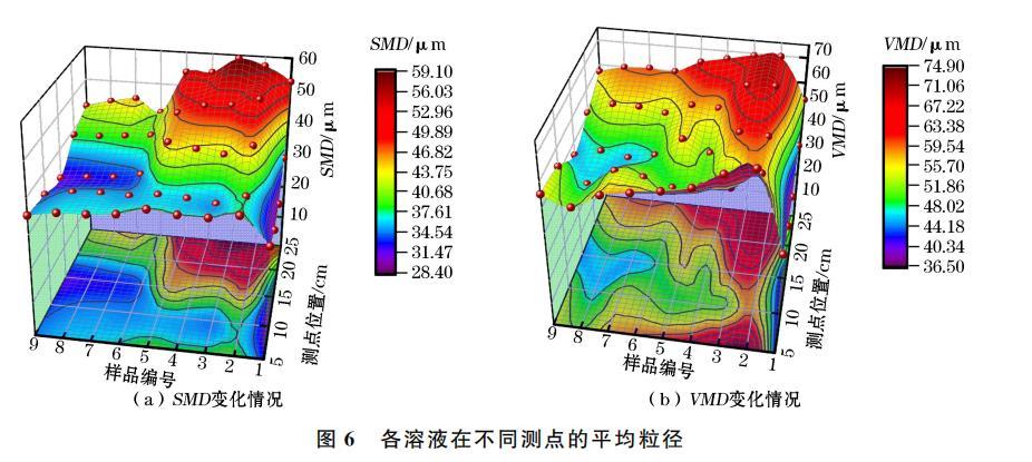 在噴霧形成過程中,空氣動力相同時,表面張力對霧滴破碎的阻礙作用決定粒徑分布情況,所以表面張力減小,溶液可分裂成無數尺寸細小的霧滴,其粒徑隨之細化。霧化是液體射出噴嘴后,受噴霧壓力作用不斷破碎呈霧滴的過程,因此礦井水表面張力減小后,霧滴破碎受到的抑制力減弱,霧化過程適量延長,霧化區范圍隨之增大。隨著液體不斷分裂破碎,霧滴粒徑逐漸集中分布于某區間,各霧滴之間趨向均一化分布。