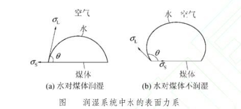 式中,θ為水與煤表面的接觸角,它是指在固、液、氣三相交界處,自固-液界面經(jīng)液體內(nèi)部而到液-氣界面的夾角。如果接觸角θ<90°屬可濕潤煤體,在相同的水表面張力系數(shù)條件下,θ角愈小,毛細(xì)作用力則愈大,增強了注水動力,潤濕能力愈大;若濕潤邊角θ>90°屬于不可濕潤煤體,θ角愈大,潤濕能力愈小。