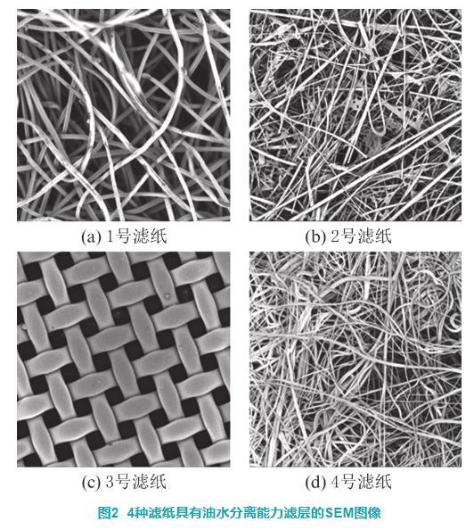 使用Phonem Pro X掃描電子顯微鏡(scanning electron microscope,SEM)在500倍放大倍率下拍攝的4種濾紙的微觀結(jié)構(gòu)如圖2所示。1號濾紙由直徑約為15μm的親水纖維構(gòu)成;2號濾紙的親水層由粗細(xì)不同的纖維通過樹脂粘接而成,其中粗纖維還起到增加親水層物理強(qiáng)度的作用;3號濾紙由直徑約為45μm的聚四氟乙烯纖維絲編制,兩根纖維之間的距離約為44μm;4號濾紙的b層由疏水材料通過熔噴工藝制成,在平面上纖維分布疏密不均但在空間內(nèi)有著較好的孔隙分布。除了3號濾紙外,其余濾紙均具有油水分離層,同時也具有較為復(fù)雜的空間結(jié)構(gòu)。