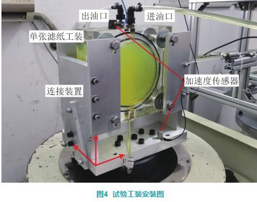 單張濾紙工裝由兩塊50 mm厚的有機(jī)玻璃制成,在頂部加工進(jìn)出油口,在底部加工放水口。單張濾紙工裝和振動試驗臺通過一個特制的鋁質(zhì)底座進(jìn)行連接,如圖4所示。